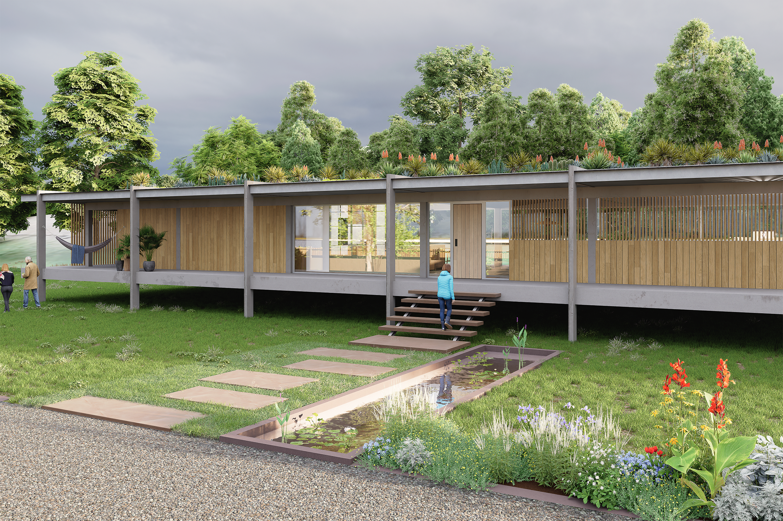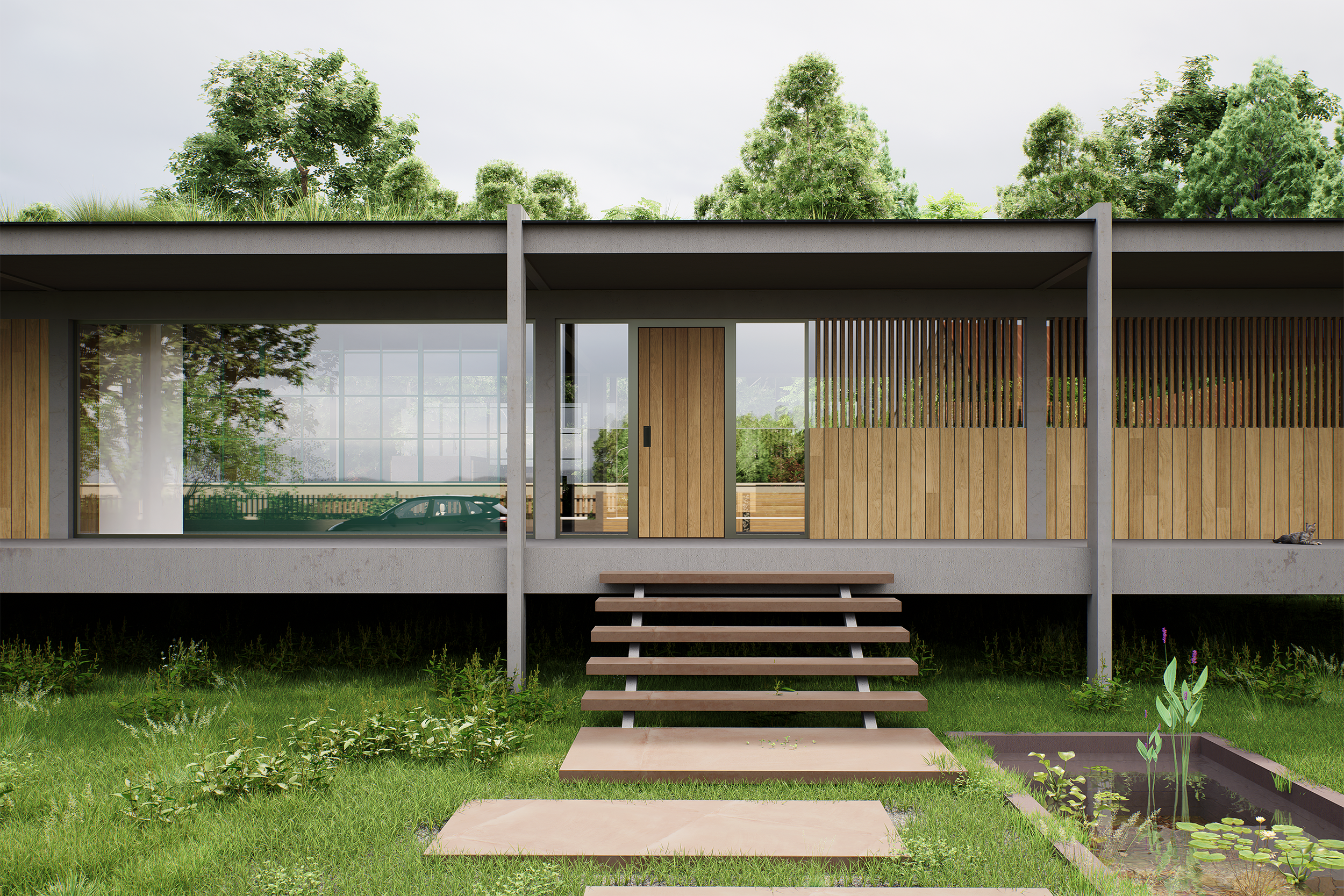 Ce projet repose sur une volonté de fluidité. La structure s'étire sur toute la longueur du terrain, créant une silhouette basse qui respecte la ligne d'horizon.