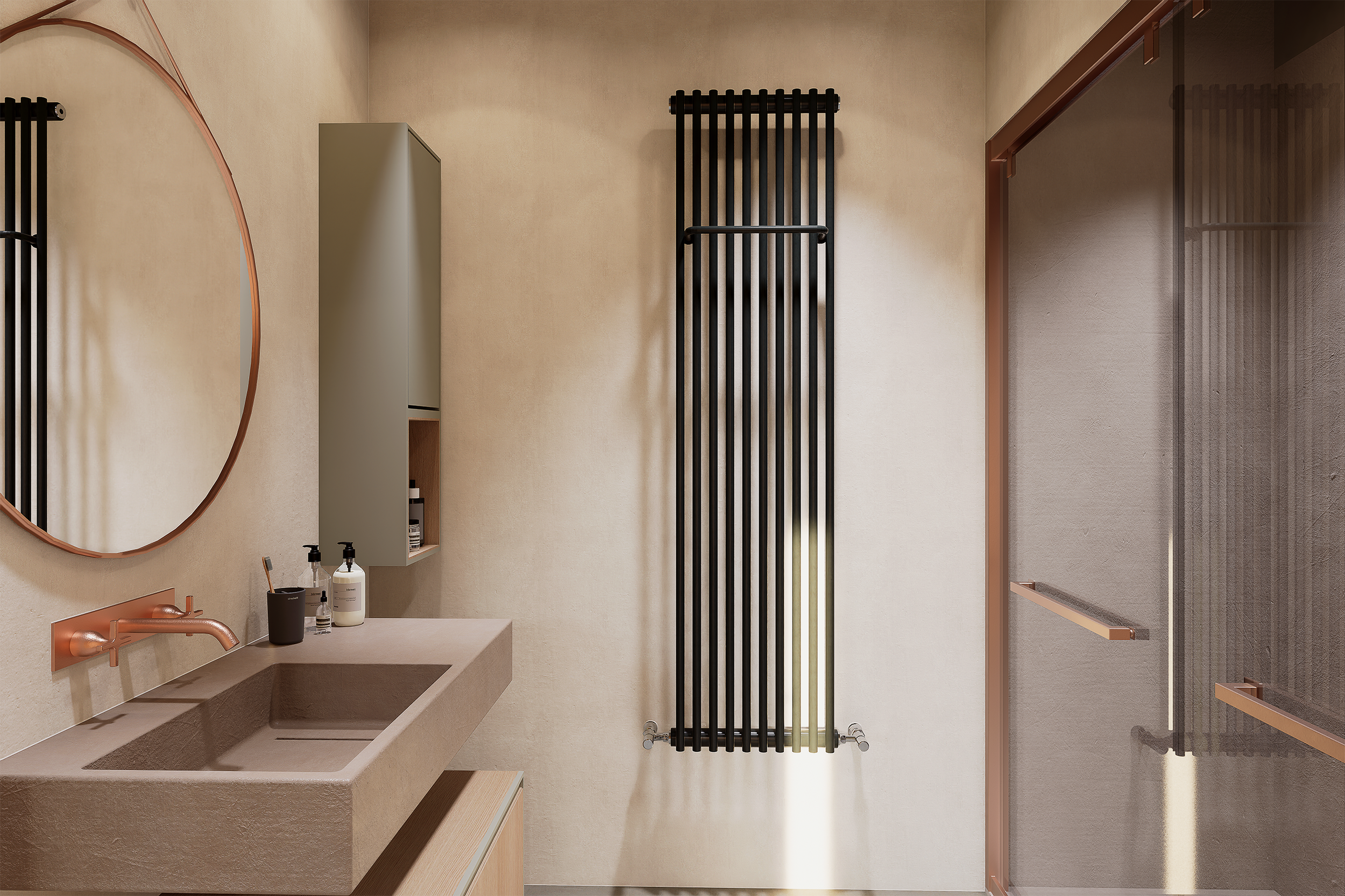 Les claustras de bois verticaux jouent avec la lumière et assurent l'intimité des occupants sans occulter la vue.