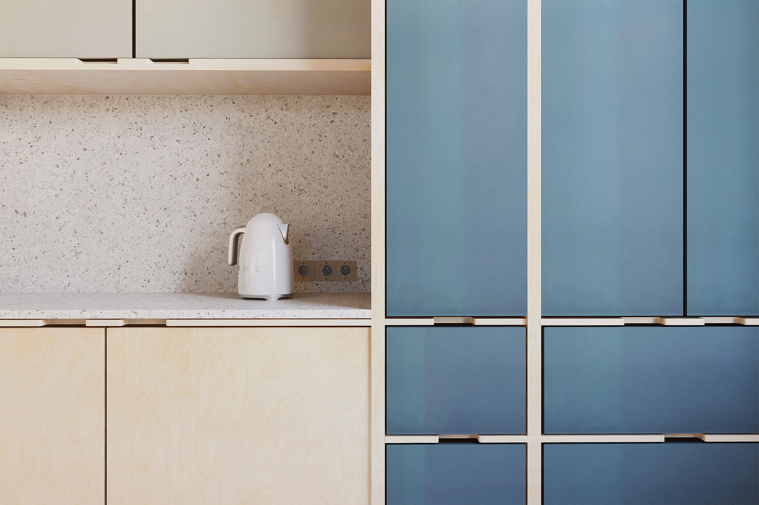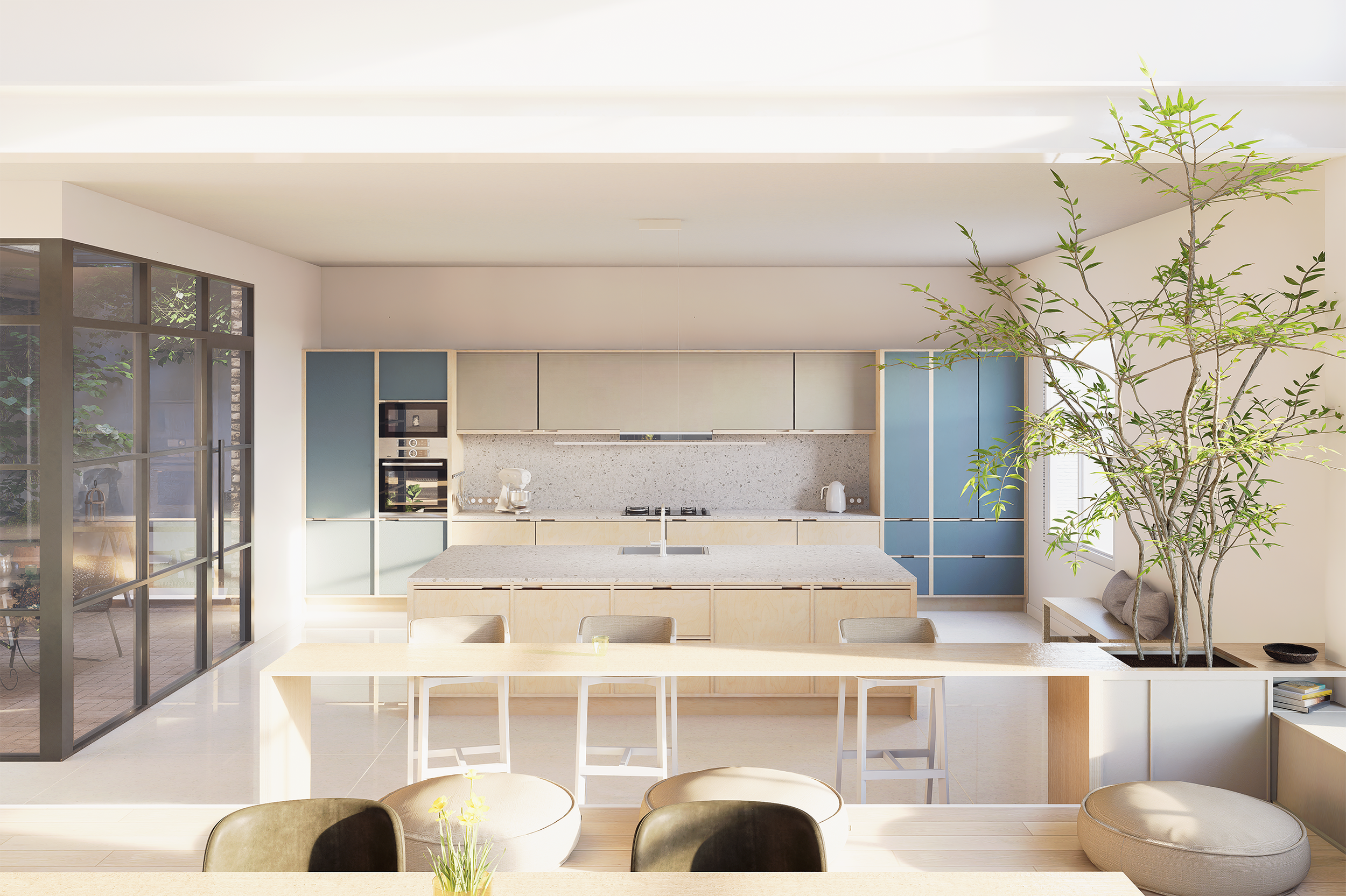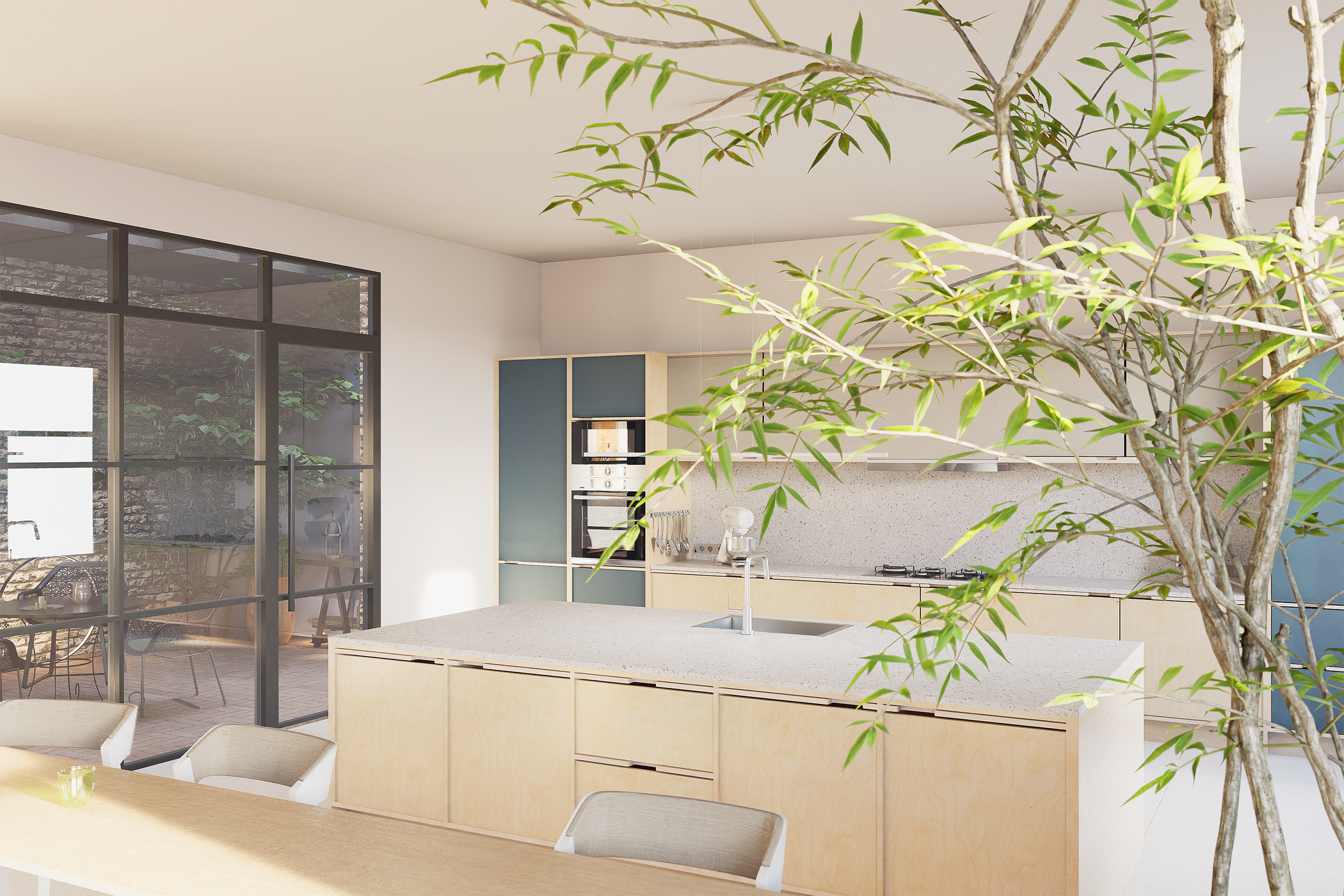 Le patio intérieur est né de cette réflexion. Implanté dans la cuisine, il agit comme un puits de lumière et un espace de respiration, offrant une relation permanente avec le végétal. Protégé, intime, mais pleinement ouvert sur l’intérieur, il transforme la perception des volumes et rythme les usages du quotidien.