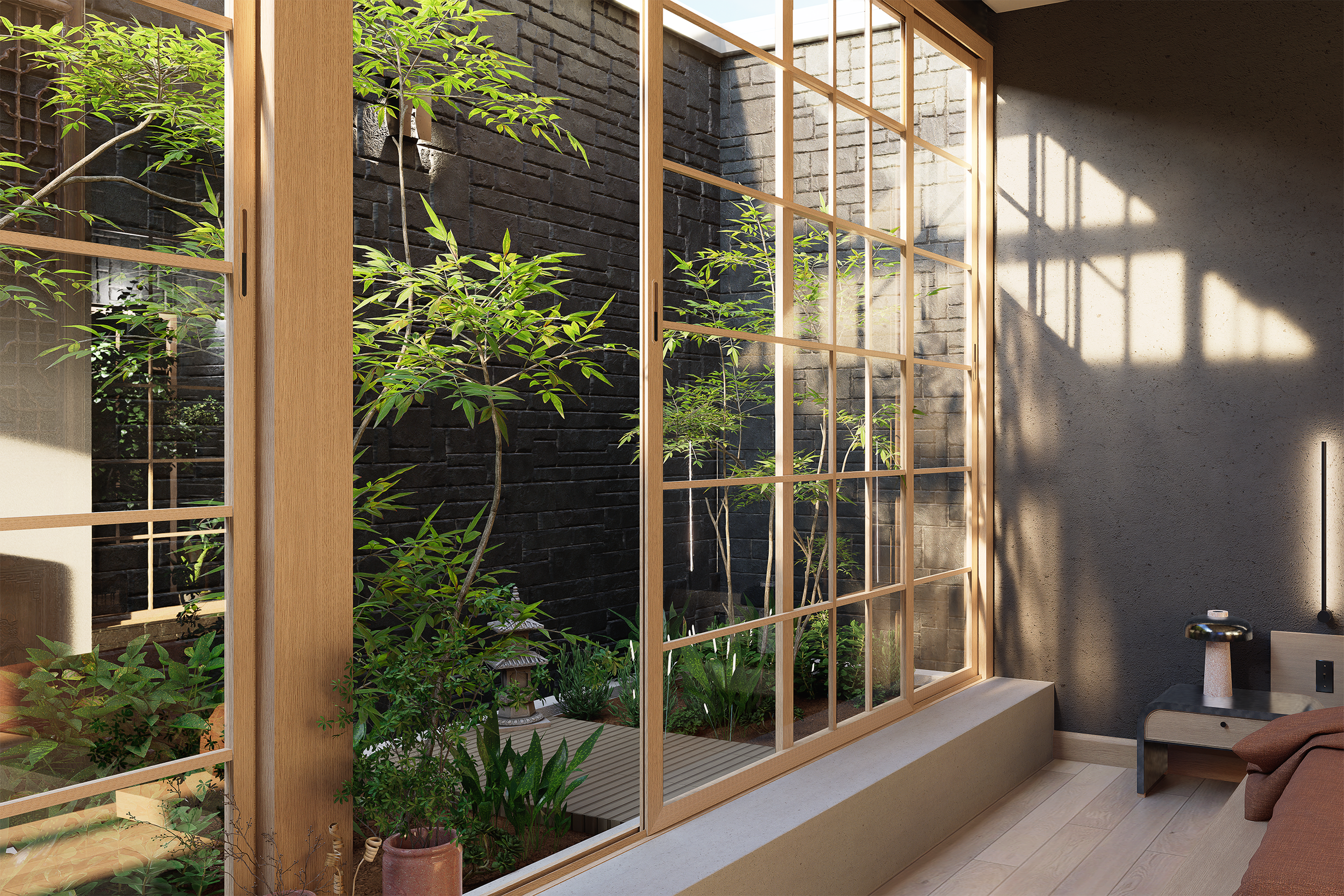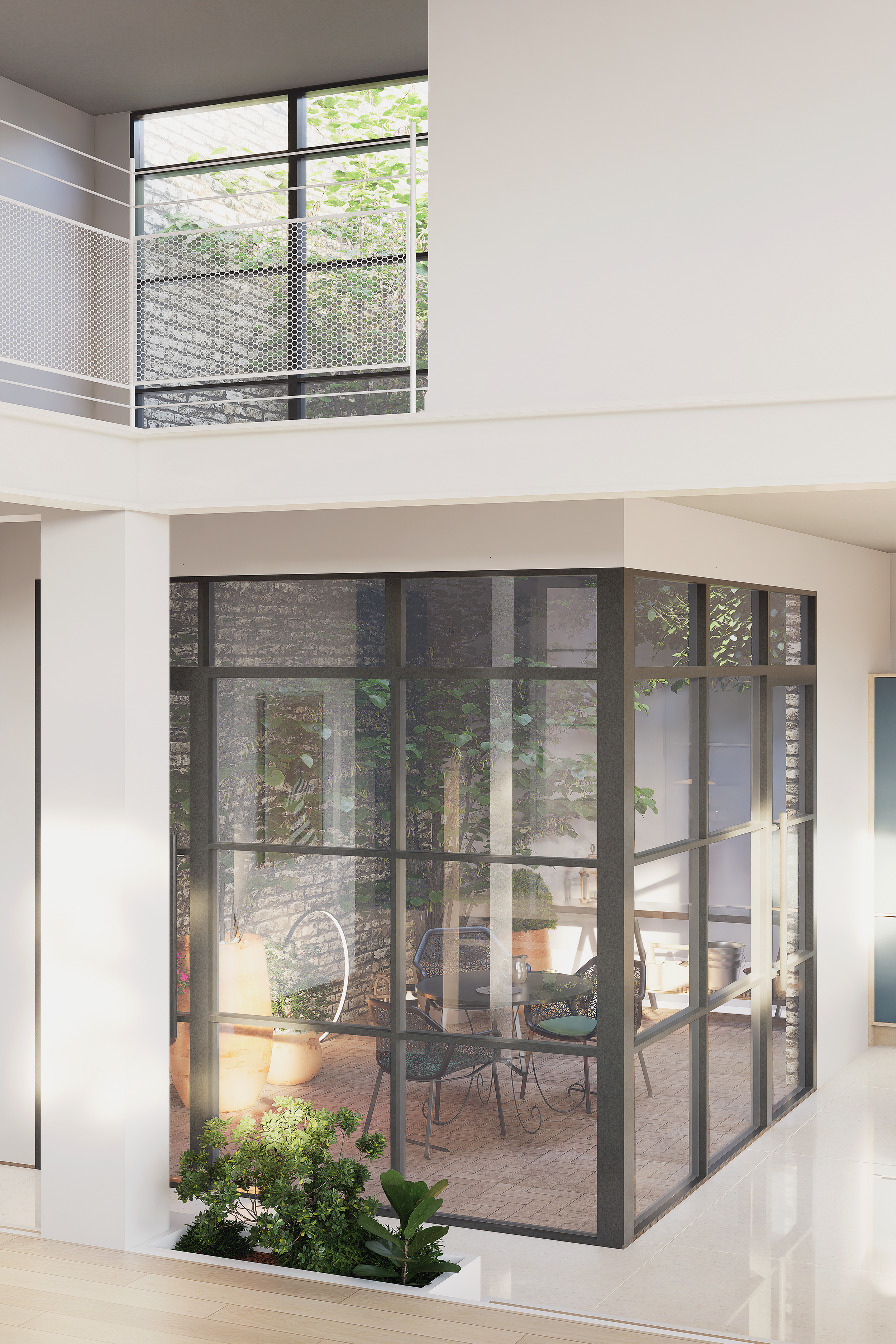 Au-delà de l’apport lumineux, ce patio introduit une nature habitée au sein d’un ancien bâtiment industriel, rééquilibrant minéral et végétal. Il devient un élément structurant du projet, à la fois architectural, sensoriel et fonctionnel.